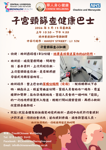 We are pleased to invite our Chinese Patients for a cervical screening test on our Living Well Bus on 13th March. We are delivering this event in collaboration with Chinese Wellbeing to help make the experience friendly and supportive for our Chinese community.